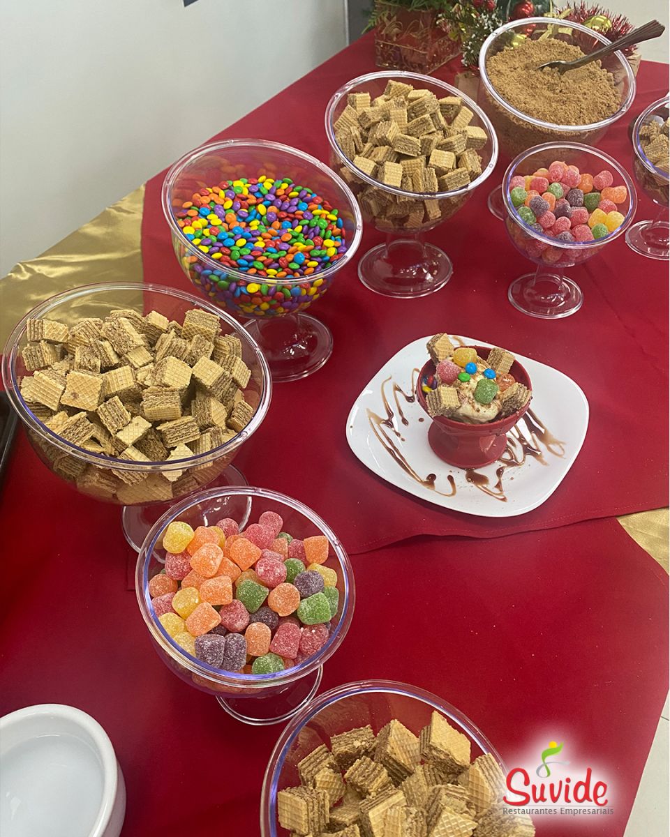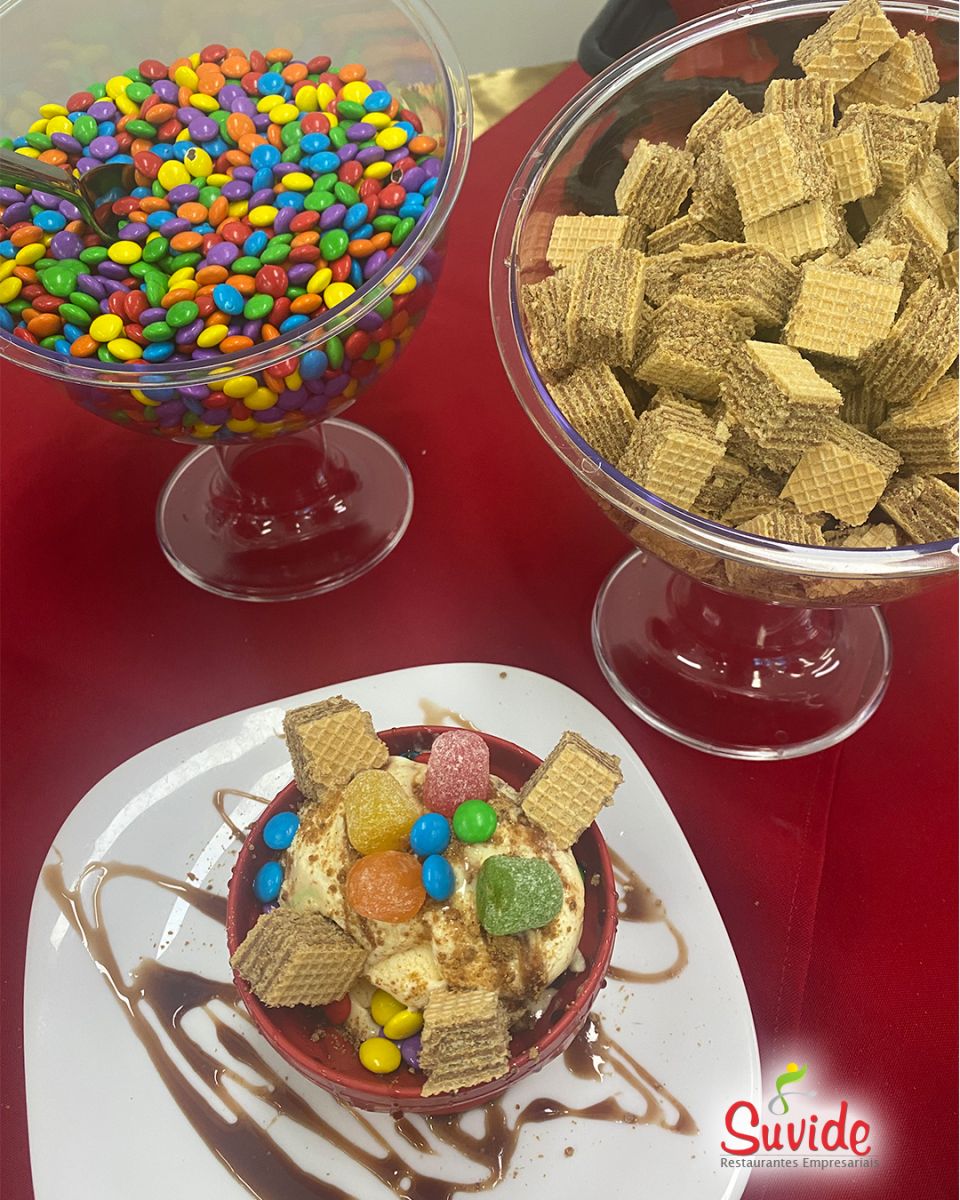 Nesse ALMOÇO ESPECIAL oferecemos ao nosso cliente um delicioso BUFFET DE SORVETES repleto de acompanhamentos de dar água na boca, como FRUTAS, BALA DE GOMA, CONFETES DE CHOCOLATE COLORIDOS, FAROFA DE PAÇOCA, GRANULADOS COLORIDOS e muito mais...