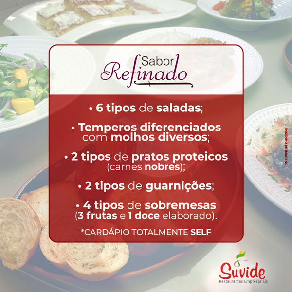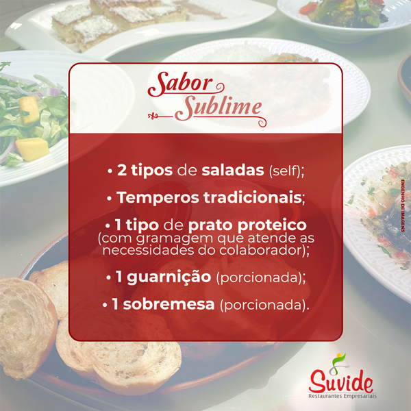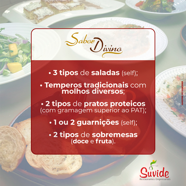 Descubra mais informações sobre os cardápios SABOR SUBLIME, SABOR DIVINO E SABOR REFINADO. São NUTRITIVOS, VARIADOS e DELICIOSOS...