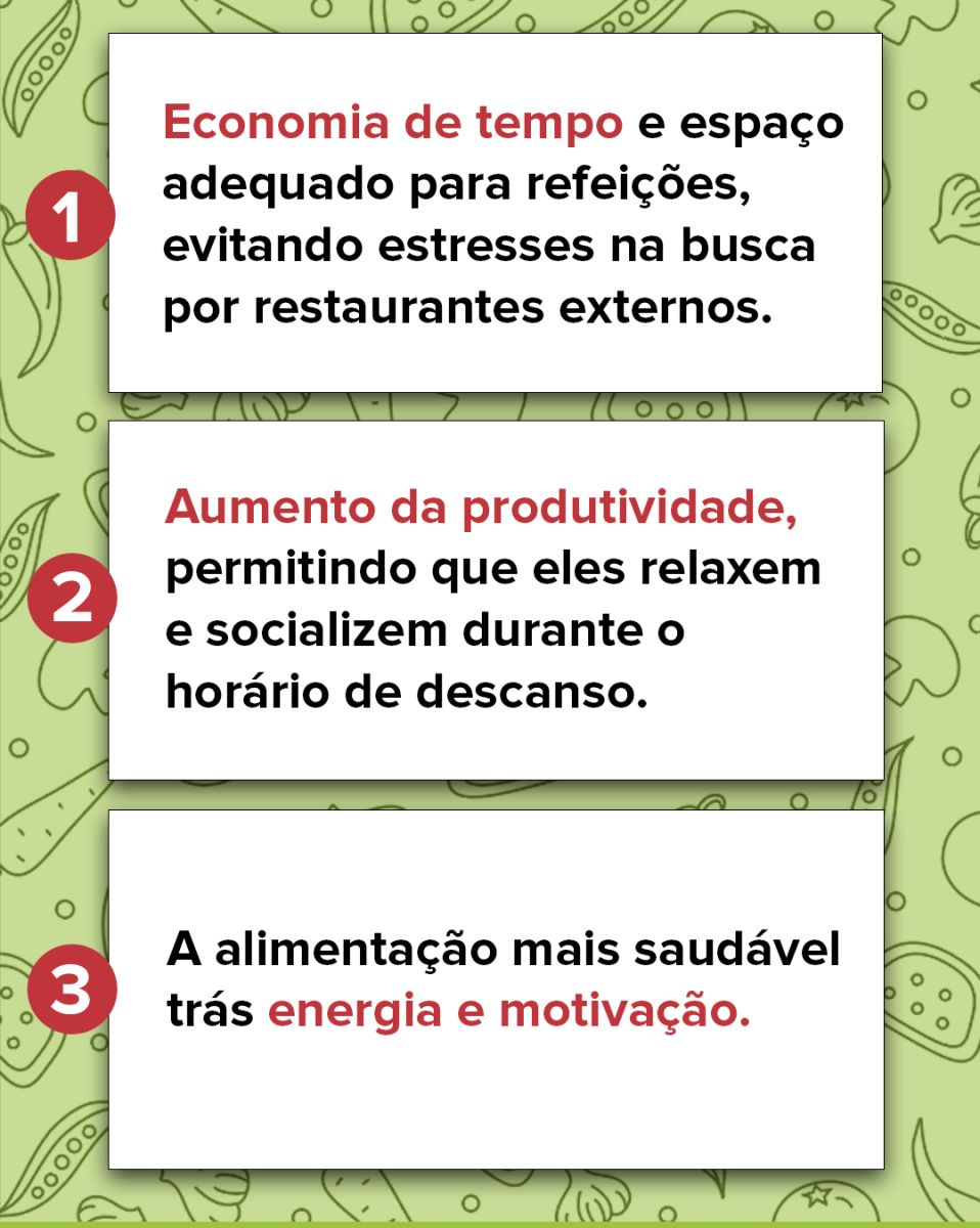São inúmeras as vantagens de investir em um restaurante empresarial em prol dos seus funcionários. Entre elas a redução de estresse, economia de tempo dos funcionários entre outros.