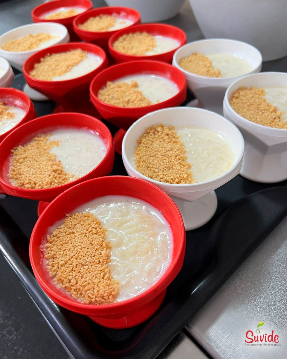 . Um arroz doce cremoso com crocante de amendoim, trazendo aquele gostinho caseiro que aquece o coração.