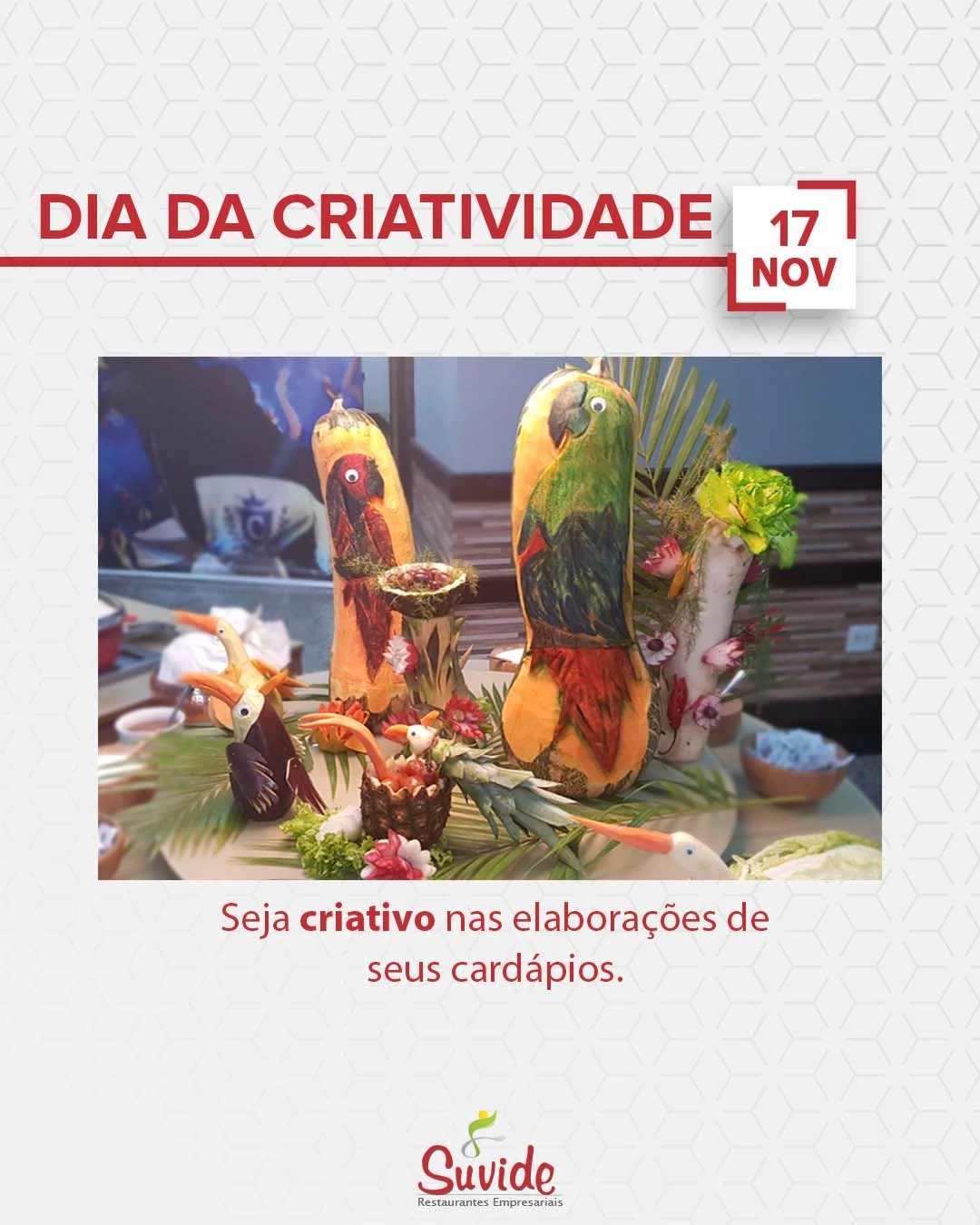 Nós, da Suvide, entendemos que a criatividade faz parte de nossos serviços e atendimento, por isso surpreenda seus colaboradores, inovando os cardápios!