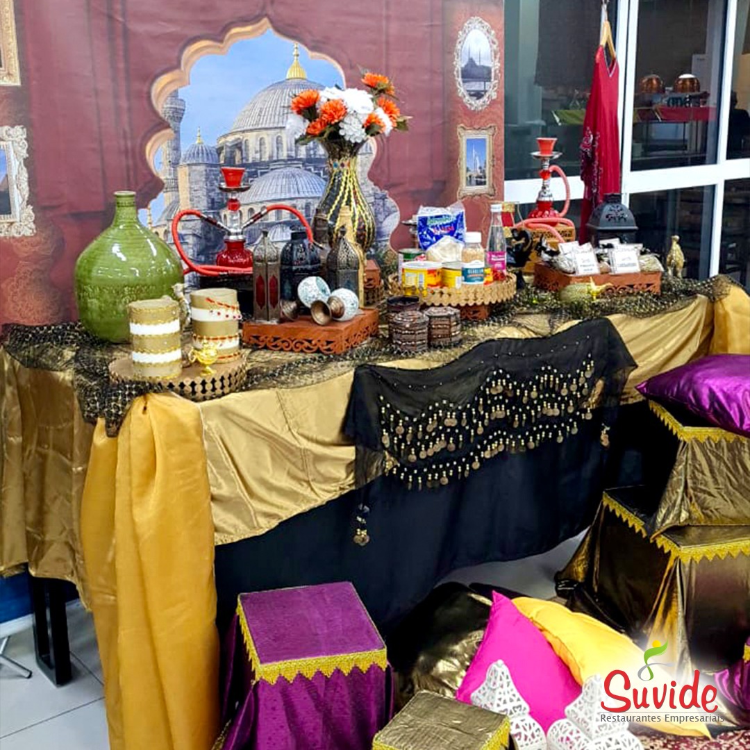 Realizamos esse evento para todos os nossos clientes e, como sempre, caprichamos na DECORAÇÃO trazendo elementos da cultura local, incluindo PRATOS TÍPICOS ÁRABES no cardápio do dia de acordo com o contrato de cada cliente.
