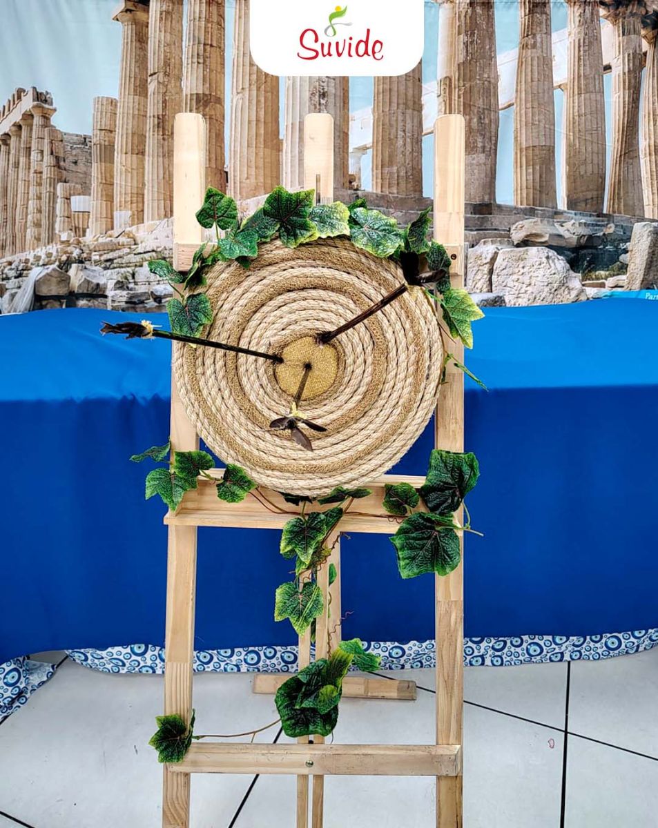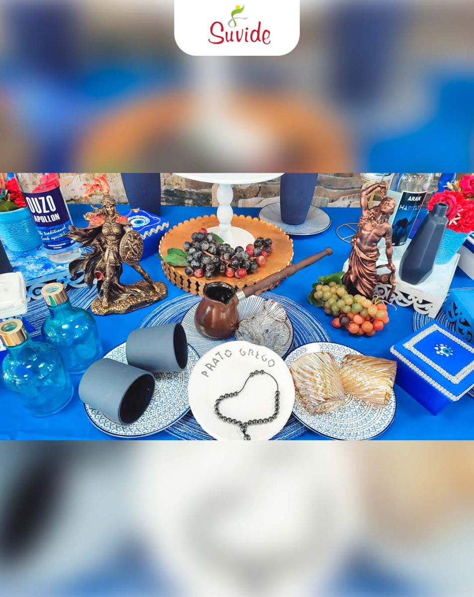 Montamos uma mesa com algumas referências da mitologia como deuses gregos, uvas, vasos e pratos que eles costumam quebrar em momentos festivos.