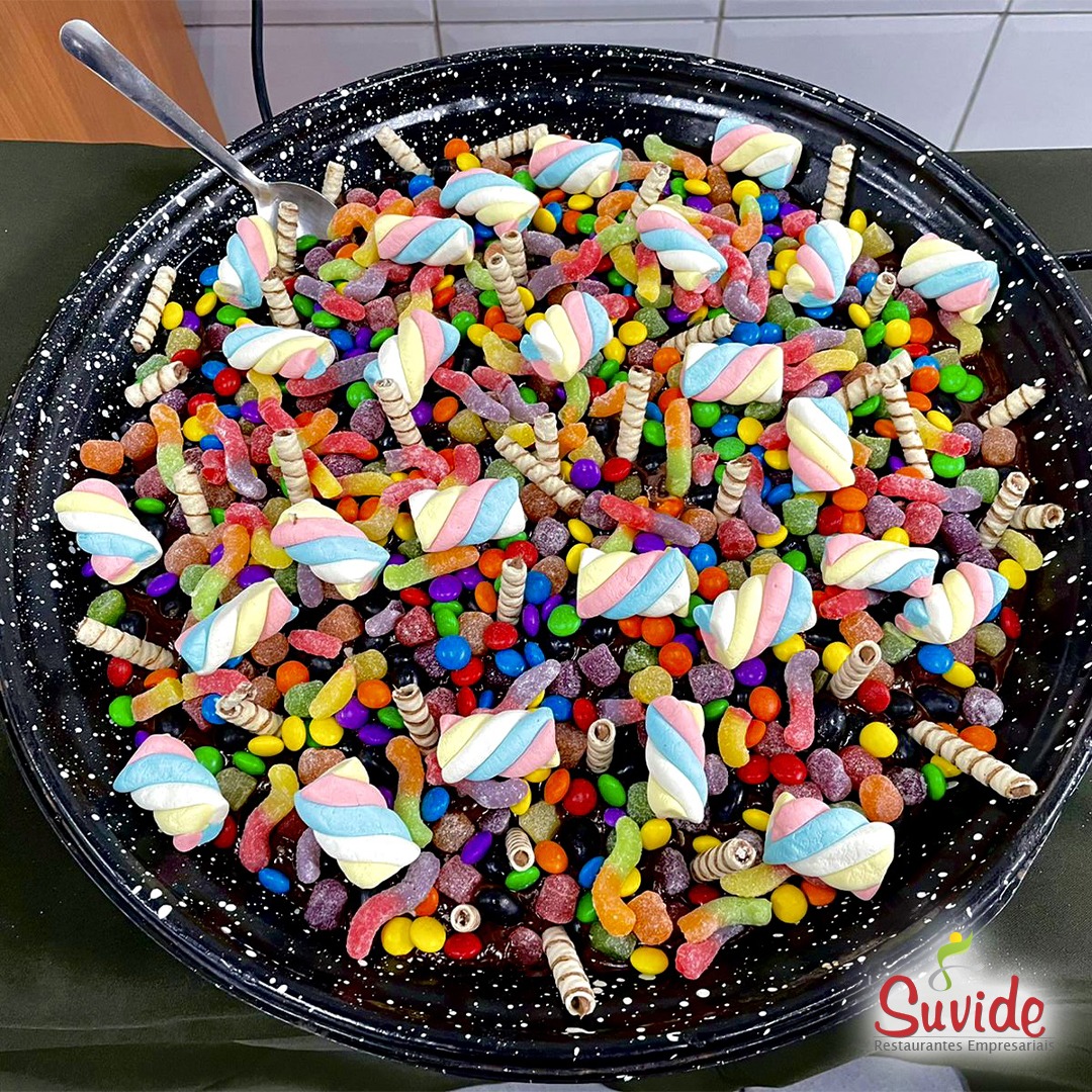 Para nossa paella doce preparamos uma GANACHE DE CHOCOLATE e colocamos por cima BALAS de goma, CONFEITOS, MARSHMALLOW, entre outras delícias.