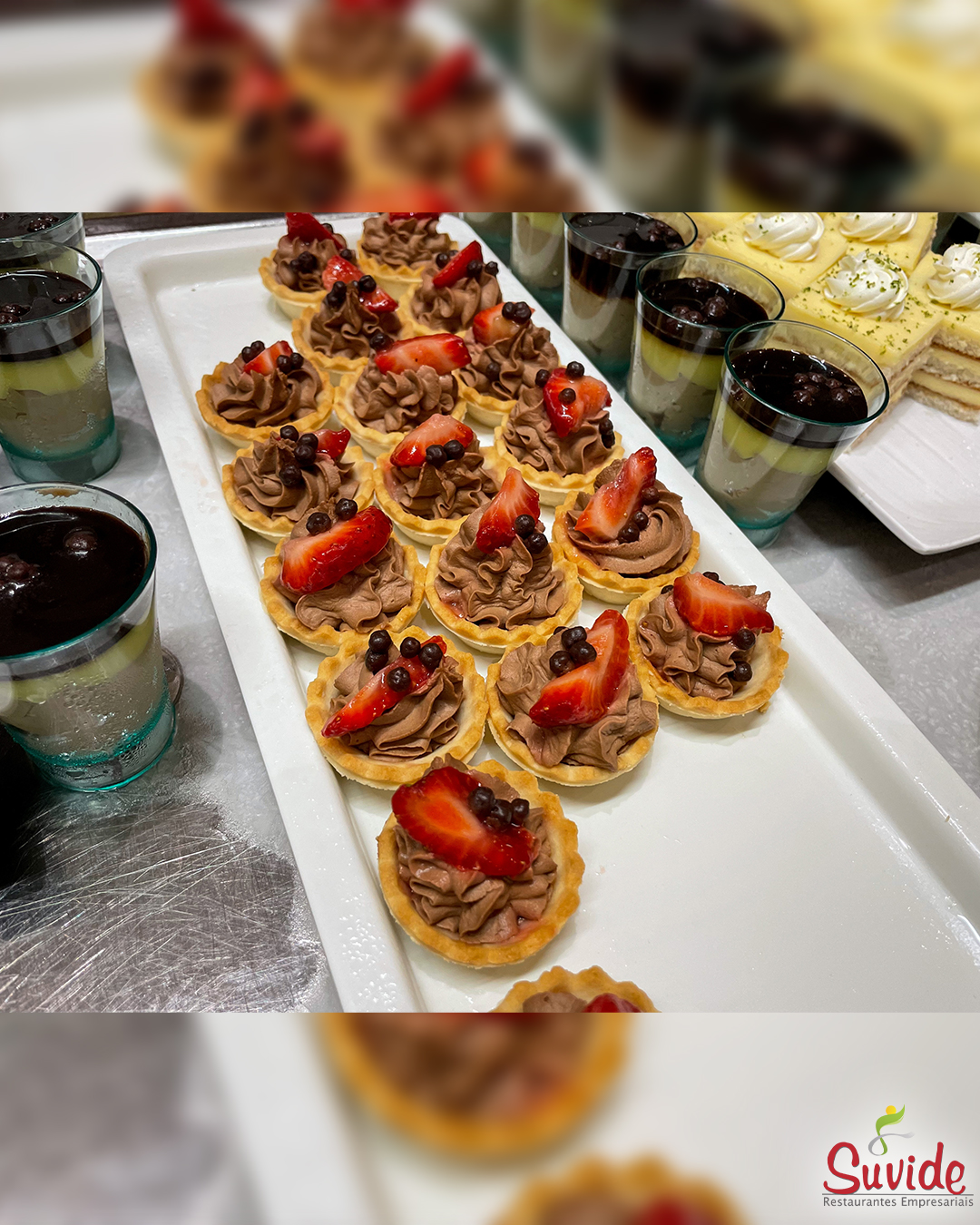 Apresentamos diversas opções de doces, como essas deliciosas tarteletes de chocolate e morango. Os colaboradores amam!