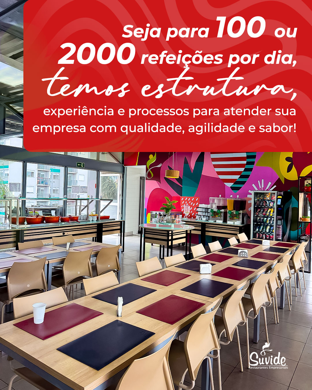 A SUVIDE tem estrutura completa, experiência e processos eficientes para atender desde 100 até 2000 refeições por dia. Tudo é pensado para que seus colaboradores aproveitem refeições deliciosas, em um ambiente aconchegante, com sabor único em cada prato.