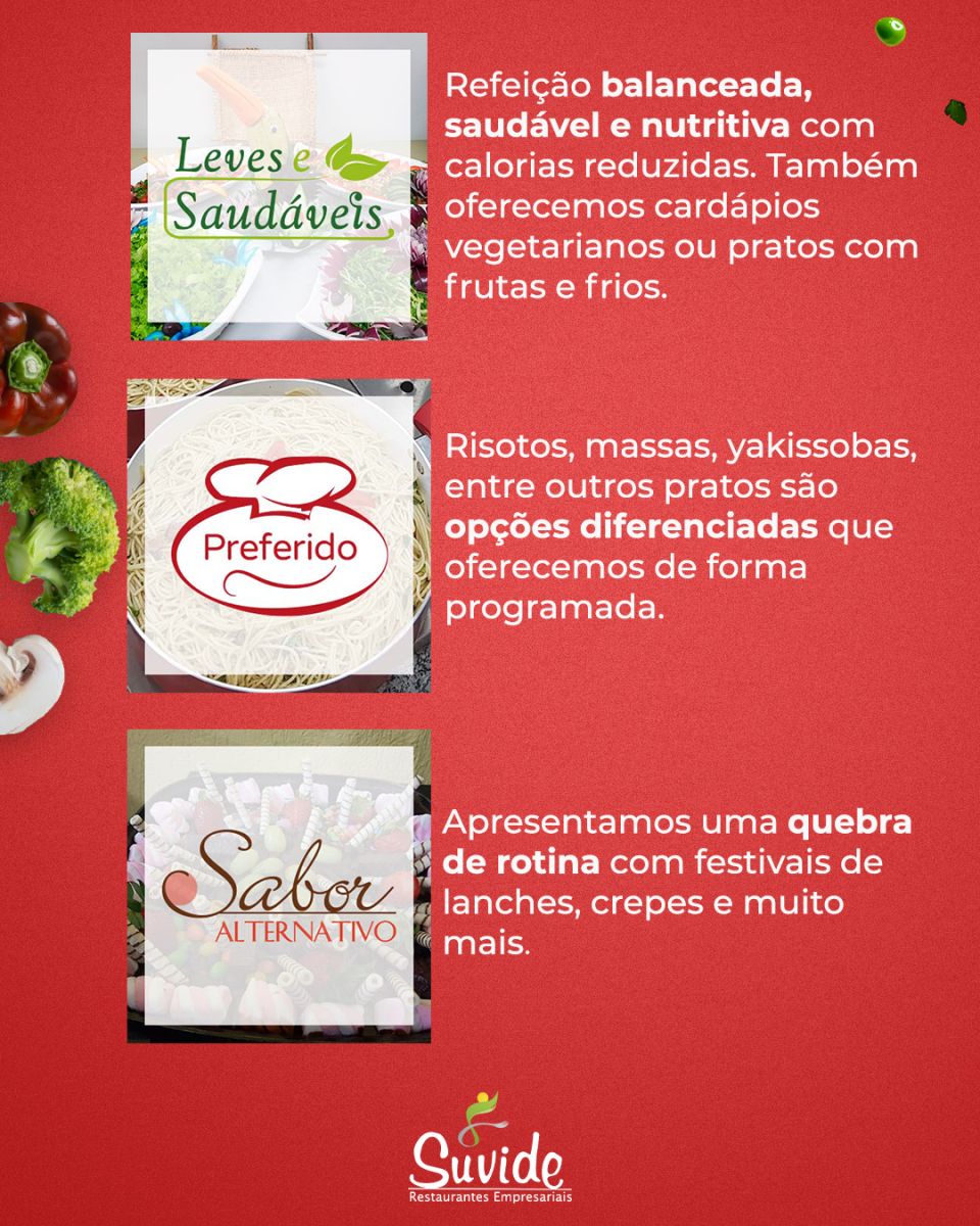 A Suvide desenvolve soluções completas em alimentação corporativa com cardápios personalizados, equilibrados e pensados para todos os perfis alimentares. Do "leve e saudável" ao "sabor alternativo", oferecemos variedade com foco em bem-estar e nutrição.