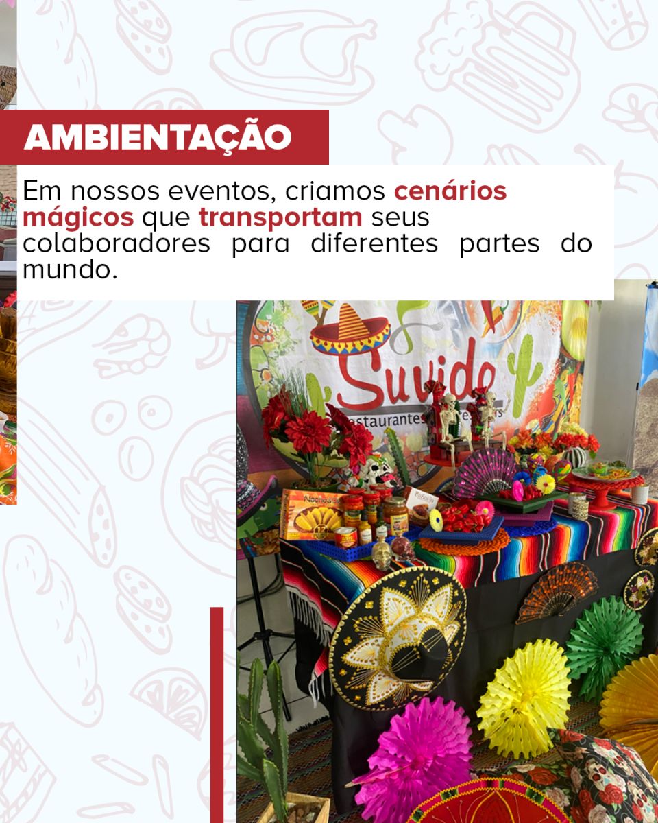 Em nossos eventos, transportamos seus colaboradores para diferentes partes do mundo, com ambiente temático, banners fotográficos e muito mais. Os cardápios são especialmente elaborados com comidas típicas, garantindo uma experiência gastronômica única.