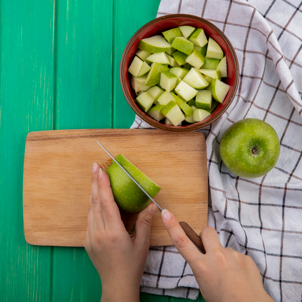 Lave bem as maçãs (com casca) e corte em cubos ou fatias.
