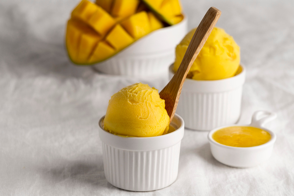 Está pronto! Este sorvete é uma sobremesa ideal para refrescar dias mais quentes e ainda combina a cremosidade do mamão com a doçura irresistível da manga, proporcionando uma experiência única de sabor.