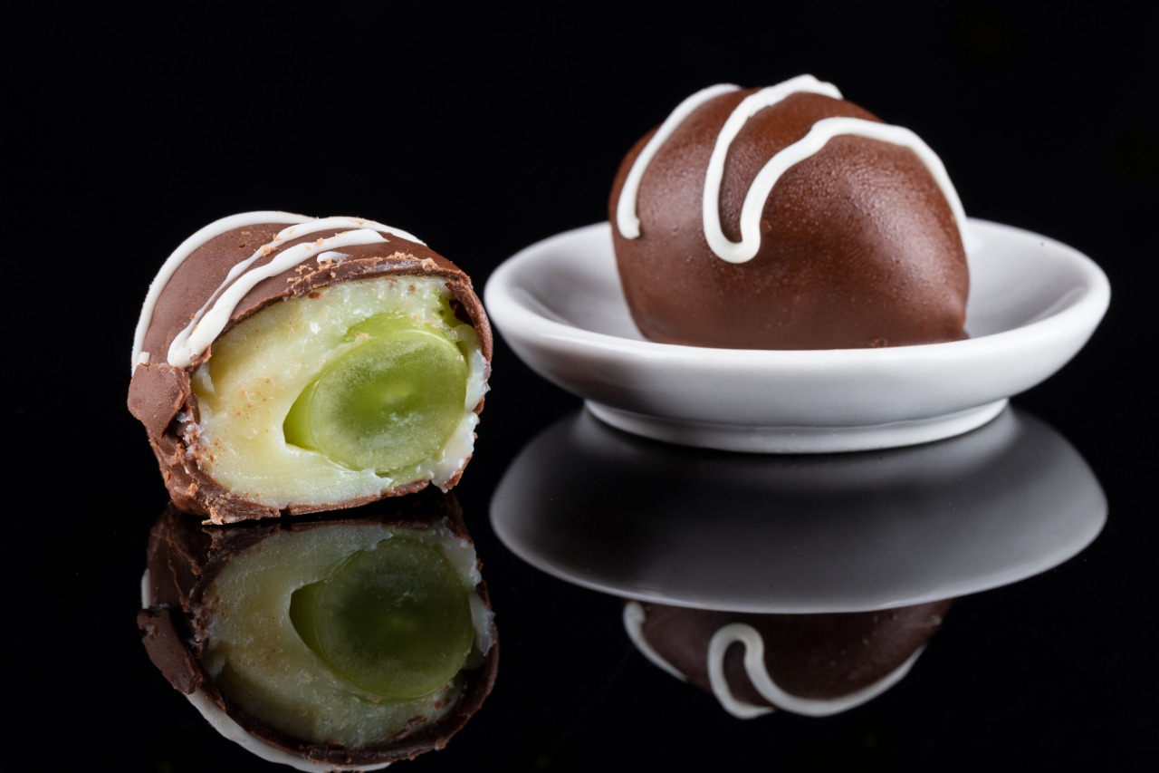 Pegue pequenas porções do recheio e abra com as mãos, colocando uma uva dentro e fechando bem. Após realizar essa etapa com todas as uvas, derreta o chocolate e banhe as uvas envolvidas pelo recheio. Em seguida coloque em uma grade para deixar o chocolate escorrer. Depois, forre o fundo de uma forma com uma folha de papel toalha e coloque os bombons em cima, reservando na geladeira até servir. Essa receita rende até 18 bombons.